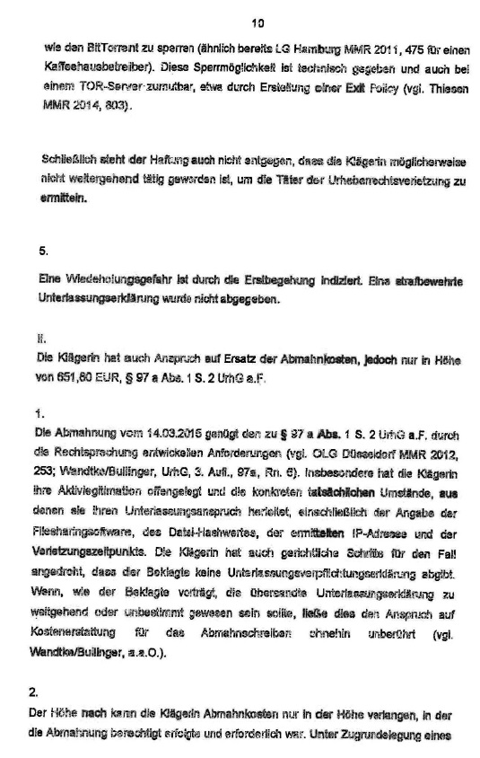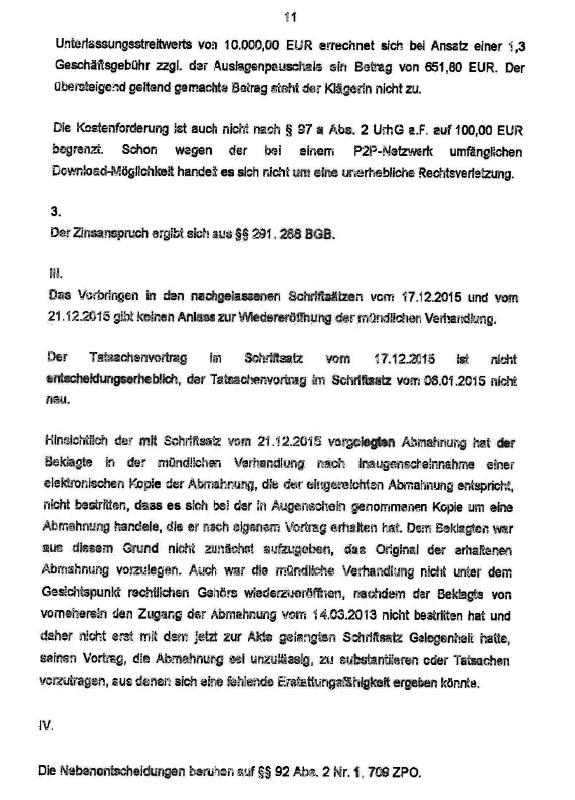 Der Beklagten ist nicht darin zu folgen, dass die Forderung nach Kostenersatz für die Abmahnung der Höhe nach gemäß § 97a Abs. 2 des Urheberrechtsgesetzes a.F. zu deckeln sei. Nach dieser Vorschrift ist der Ersatz der erforderlichen Aufwendungen für die erstmalige Abmahnung in einfach gelagerten Fällen mit einer nur unerheblichen Rechtsverletzung außerhalb des geschäftlichen Verkehrs auf 100,00 EUR beschränkt. Im Streitfall liegt aber gerade eine nicht unerhebliche Rechtsverletzung vor. Zwar ist nur ein Computerspiel betroffen. Die vorliegende Rechtsverletzung ist aber nach den gemäß § 97a Abs. 2 Urheberrechtsgesetz a.F. anzuwendenden Maßstäben qualitativ nicht als unerheblich zu bewerten. Die internetbegangenen Urheberrechtsverstöße können in ihrer Häufung zu erheblichen Umsatzeinbußen in der betroffenen Branche führen. Wer ein Computerspiel in einer Internettauschbörse zum Herunterladen anbietet, handelt im Allgemeinen nicht rein altruistisch. Er strebt zumindest mittelbar einen wirtschaftlichen Vorteil an, weil er eigene finanzielle Aufwendungen für den erwünschten Erwerb der vom Tauschpartner kostenfrei bezogenen Werke erspart. Er nimmt dabei in Kauf, dass sich dies negativ auf den Vermarktungserfolg des Rechteinhabers auswirkt (vgl. LG Frankfurt am Main, Urteil vom 08.07.2015 zu Az. 2-6 S 21114).