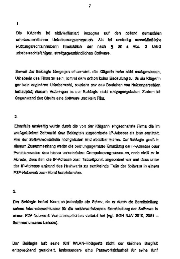 Die Klägerin hat den Verstoß der Beklagten gegen § 19a Urheberrechtsgesetz durch Anbieten des streitbefangenen Computerspiels zum Herunterladen am [Datum 1] und [Datum 2]über die ihr zum Tatzeitpunkt zugeordneten IP-Adressen [IP 1] und [IP 2] durch Vorlage der Ermittlungsdaten bezüglich der IP-Adressen und Zeitpunkte der einzelnen Verstöße (mit Uhrzeit- und Datumsangabe), die aufgrund des Einsatzes der Ermittlungs-Software [Name] der Firma [Name] erhoben worden sind, in Verbindung mit der aufgrund des Beschlusses des Landgerichts [Name] vom [Datum] (Anlage K 4, Blatt 130 ff, der Akten) eingeholten Auskunft der [Providername] (Anlage K 4, Blatt 148 ff. der Akten) schlüssig dargelegt. Der Vortrag der Beklagten zur Fehlerhaftigkeit der Ermittlungen ist nicht geeignet, Zweifel an der Richtigkeit des Klägervortrags zu begründen. Zwar trifft es zu, dass bei der Ermittlung von Urheberrechtsverletzungen und bei der Feststellung und Zuordnung von IP-Adressen im Zusammenhang mit Filesharing-Verfahren Fehler aufgetreten sind, da es sich um Massenverfahren handelt. Mit der genannten Problematik hat sich u.a. der Sachverständige Morgenstern im CR 3/11, Seite 203 ff. in seinem Beitrag "Zuverlässigkeit von IP-Adressen-Ermittlungssoftware" ausführlich auseinandergesetzt.